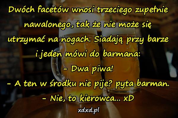 Dwóch facetów wnosi trzeciego zupełnie nawalonego, tak że nie może się utrzymać na nogach. Siadają przy barze i jeden mówi do barmana: – Dwa piwa! – A ten w środku nie pije? pyta barman. – Nie, to kierowca… xD