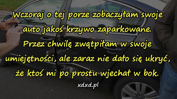 Wczoraj o tej porze zobaczyłam swoje auto jakoś krzywo zaparkowane. Przez chwilę zwątpiłam w swoje umiejętności, ale zaraz nie dało się ukryć, że ktoś mi po prostu wjechał w bok.