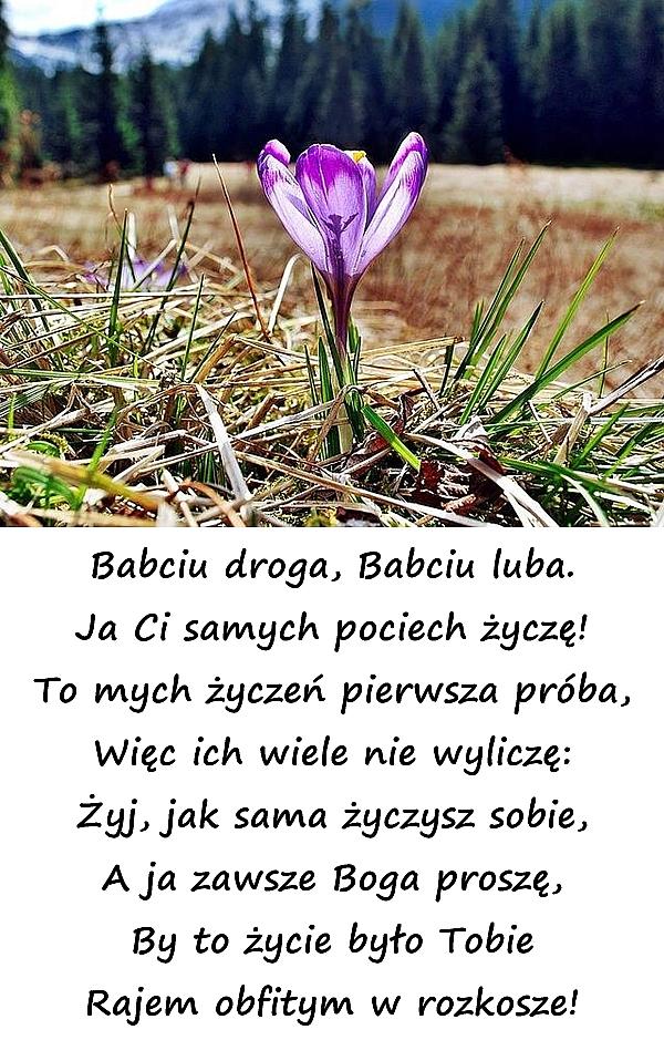 Babciu droga, Babciu luba. Ja Ci samych pociech życzę! To mych życzeń pierwsza próba, Więc ich wiele nie wyliczę: Żyj, jak sama życzysz sobie, A ja zawsze Boga proszę, By to życie było Tobie Rajem obfitym w rozkosze!