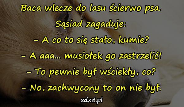 Baca wlecze do lasu ścierwo psa. Sąsiad zagaduje: – A co to się stało, kumie? – A aaa… musiołek go zastrzelić! – To pewnie był wściekły, co? – No, zachwycony to on nie był.