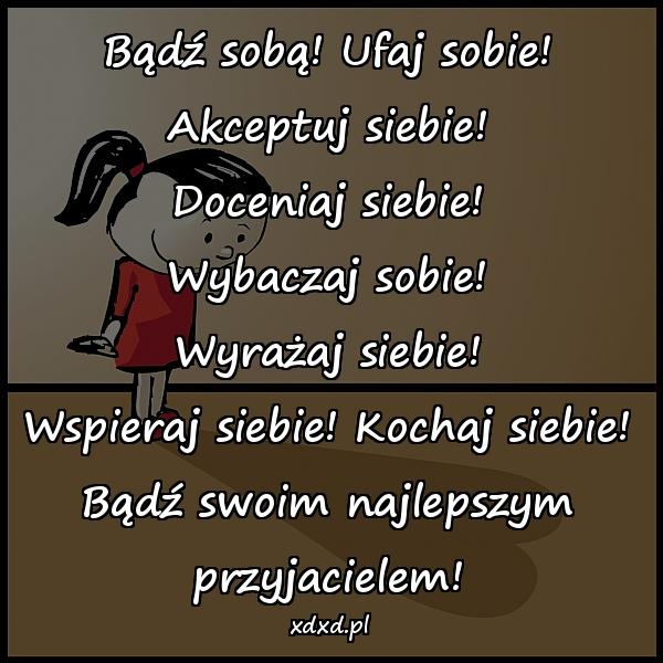 Bądź sobą! Ufaj sobie! Akceptuj siebie! Doceniaj siebie! Wybaczaj sobie! Wyrażaj siebie! Wspieraj siebie! Kochaj siebie! Bądź swoim najlepszym przyjacielem!