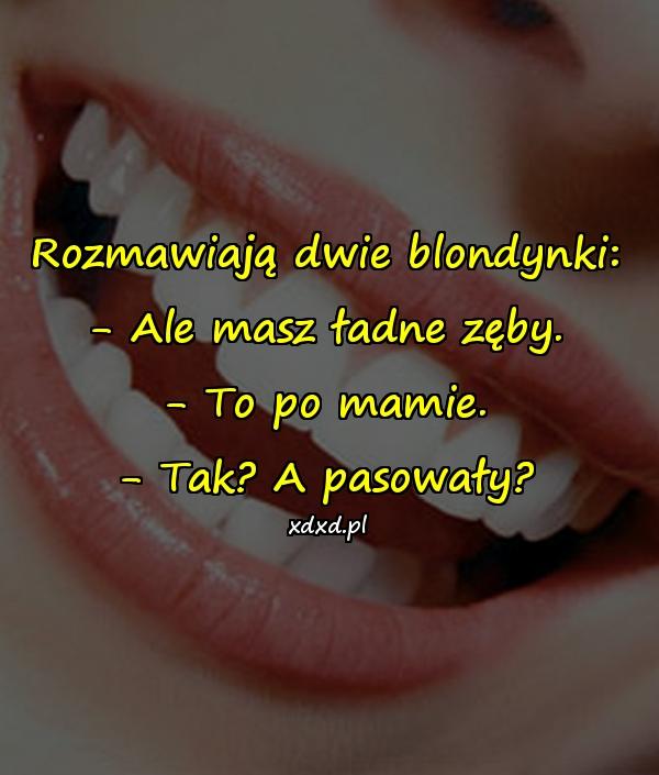 Rozmawiają dwie blondynki: – Ale masz ładne zęby. – To po mamie. – Tak? A pasowały?