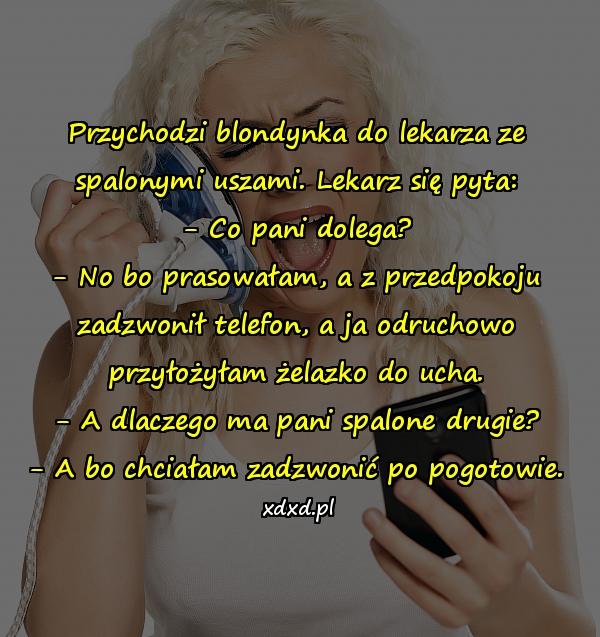 Przychodzi blondynka do lekarza ze spalonymi uszami. Lekarz się pyta: – Co pani dolega? – No bo prasowałam, a z przedpokoju zadzwonił telefon, a ja odruchowo przyłożyłam żelazko do ucha. – A dlaczego ma pani spalone drugie? – A bo chciałam zadzwonić po pogotowie.