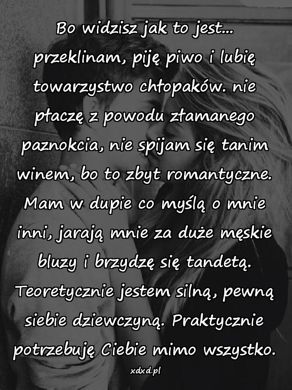 Bo widzisz jak to jest… przeklinam, piję piwo i lubię towarzystwo chłopaków. nie płaczę z powodu złamanego paznokcia, nie spijam się tanim winem, bo to zbyt romantyczne. Mam w dupie co myślą o mnie inni, jarają mnie za duże męskie bluzy i brzydzę się tandetą. Teoretycznie jestem silną, pewną siebie dziewczyną. Praktycznie potrzebuję Ciebie mimo wszystko.