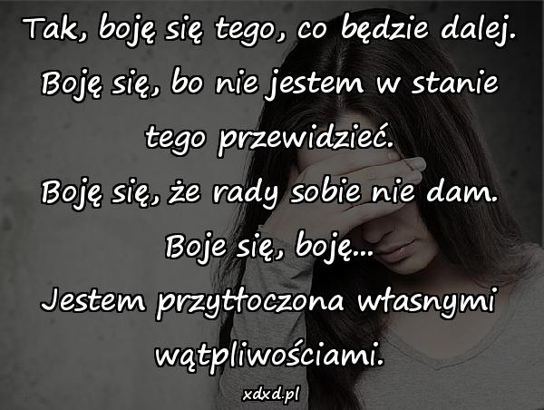 Tak, boję się tego, co będzie dalej. Boję się, bo nie jestem w stanie tego przewidzieć. Boję się, że rady sobie nie dam. Boje się, boję… Jestem przytłoczona własnymi wątpliwościami.