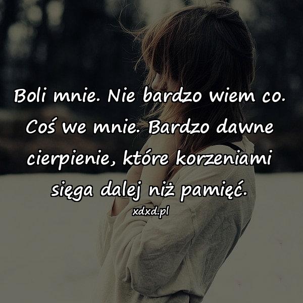 Boli mnie. Nie bardzo wiem co. Coś we mnie. Bardzo dawne cierpienie, które korzeniami sięga dalej niż pamięć.
