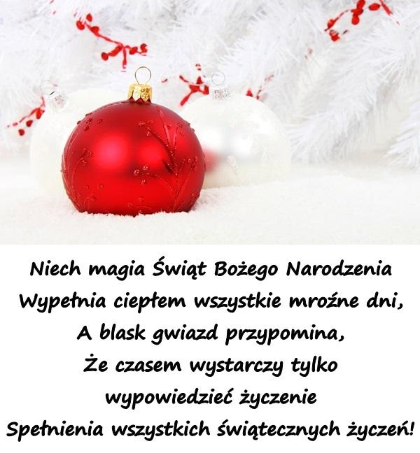 Niech magia Świąt Bożego Narodzenia Wypełnia ciepłem wszystkie mroźne dni, A blask gwiazd przypomina, Że czasem wystarczy tylko wypowiedzieć życzenie Spełnienia wszystkich świątecznych życzeń!