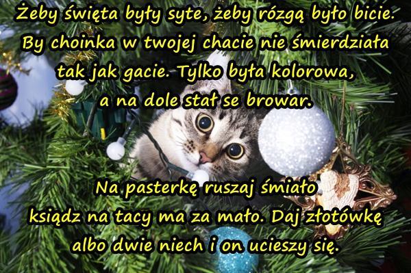 Żeby święta były syte, żeby rózgą było bicie. By choinka w twojej chacie nie śmierdziała tak jak gacie. Tylko była kolorowa, a na dole stał se browar. Na pasterkę ruszaj śmiało ksiądz na tacy ma za mało. Daj złotówkę albo dwie niech i on ucieszy się.