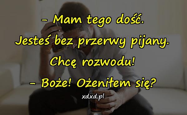 – Mam tego dość. Jesteś bez przerwy pijany. Chcę rozwodu! – Boże! Ożeniłem się?