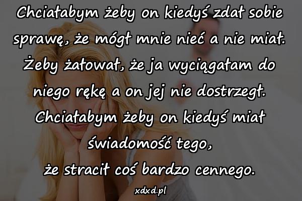 Chciałabym żeby on kiedyś zdał sobie sprawę, że mógł mnie nieć a nie miał. Żeby żałował, że ja wyciągałam do niego rękę a on jej nie dostrzegł. Chciałabym żeby on kiedyś miał świadomość tego, że stracił coś bardzo cennego.