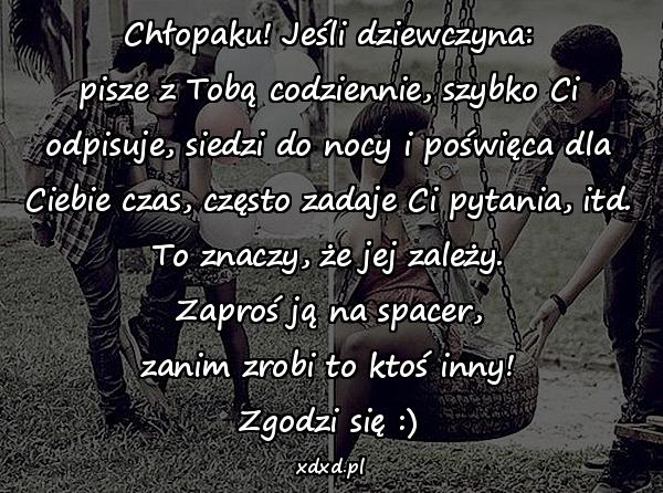 Chłopaku! Jeśli dziewczyna: pisze z Tobą codziennie, szybko Ci odpisuje, siedzi do nocy i poświęca dla Ciebie czas, często zadaje Ci pytania, itd. To znaczy, że jej zależy. Zaproś ją na spacer, zanim zrobi to ktoś inny! Zgodzi się 🙂