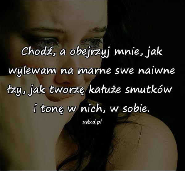Chodź, a obejrzyj mnie, jak wylewam na marne swe naiwne łzy, jak tworzę kałuże smutków i tonę w nich, w sobie.