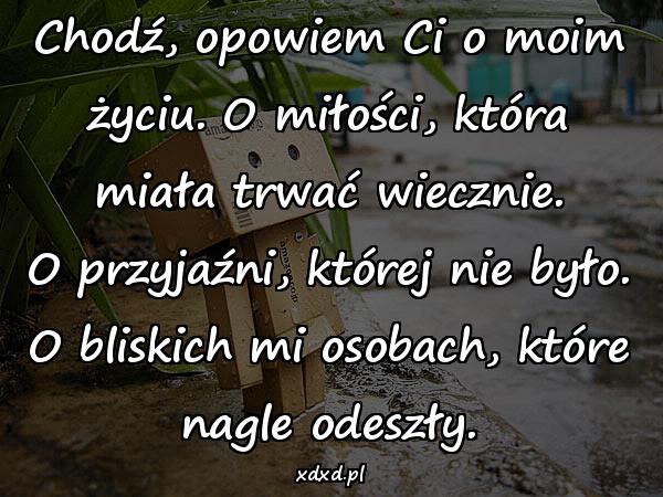 Chodź, opowiem Ci o moim życiu. O miłości, która miała trwać wiecznie. O przyjaźni, której nie było. O bliskich mi osobach, które nagle odeszły.