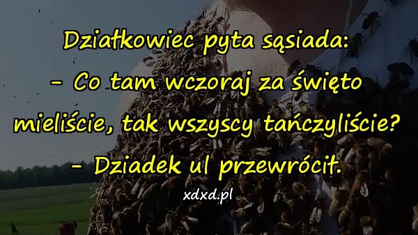 Działkowiec pyta sąsiada: – Co tam wczoraj za święto mieliście, tak wszyscy tańczyliście? – Dziadek ul przewrócił.