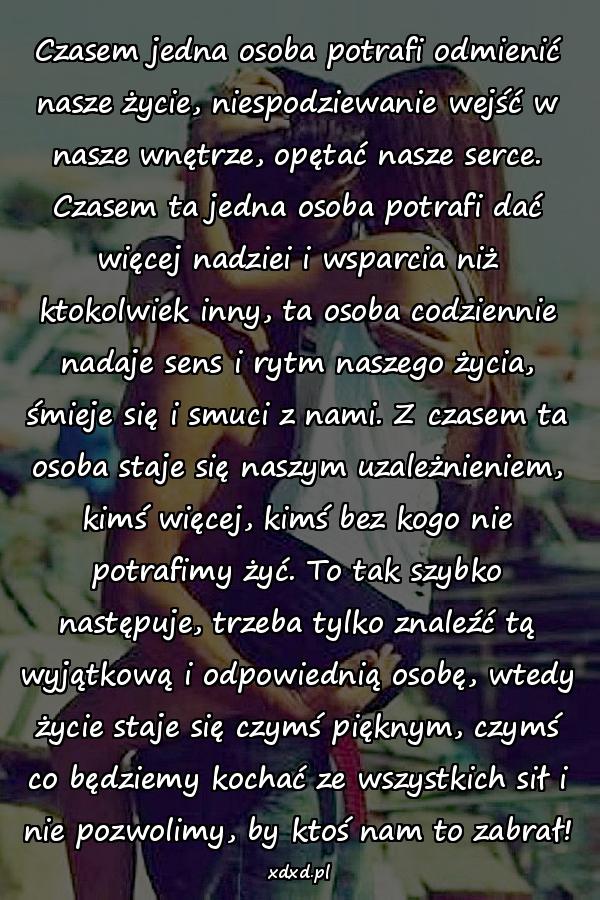 Czasem jedna osoba potrafi odmienić nasze życie, niespodziewanie wejść w nasze wnętrze, opętać nasze serce. Czasem ta jedna osoba potrafi dać więcej nadziei i wsparcia niż ktokolwiek inny, ta osoba codziennie nadaje sens i rytm naszego życia, śmieje się i smuci z nami. Z czasem ta osoba staje się naszym uzależnieniem, kimś więcej, kimś bez kogo nie potrafimy żyć. To tak szybko następuje, trzeba tylko znaleźć tą wyjątkową i odpowiednią osobę, wtedy życie staje się czymś pięknym, czymś co będziemy kochać ze wszystkich sił i nie pozwolimy, by ktoś nam to zabrał!