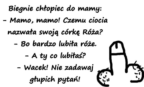 Biegnie chłopiec do mamy: – Mamo, mamo! Czemu ciocia nazwała swoją córkę Róża? – Bo bardzo lubiła róże. – A ty co lubiłaś? – Wacek! Nie zadawaj głupich pytań!