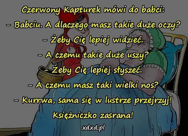 Czerwony Kapturek mówi do babci: – Babciu. A dlaczego masz takie duże oczy? – Żeby Cię lepiej widzieć. – A czemu takie duże uszy? – Żeby Cię lepiej słyszeć. – A czemu masz taki wielki nos? – Kurrwa, sama się w lustrze przejrzyj! Księżniczko zasrana!