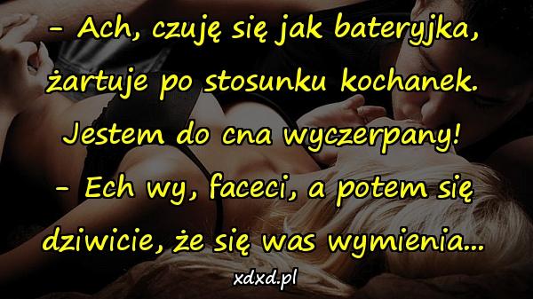 – Ach, czuję się jak bateryjka, żartuje po stosunku kochanek. Jestem do cna wyczerpany! – Ech wy, faceci, a potem się dziwicie, że się was wymienia…