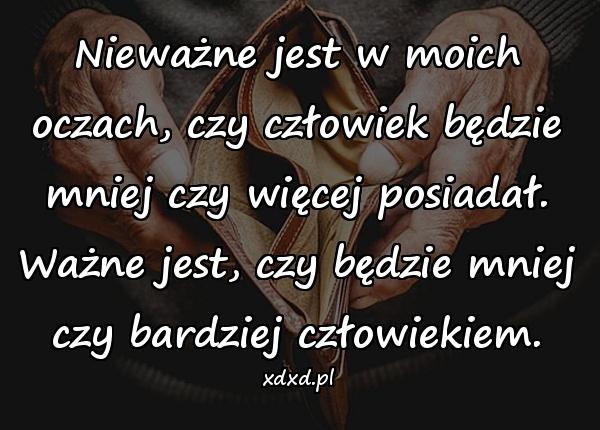 Nieważne jest w moich oczach, czy człowiek będzie mniej czy więcej posiadał. Ważne jest, czy będzie mniej czy bardziej człowiekiem.