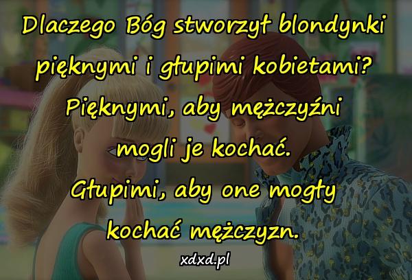 Dlaczego Bóg stworzył blondynki pięknymi i głupimi kobietami? Pięknymi, aby mężczyźni mogli je kochać. Głupimi, aby one mogły kochać mężczyzn.