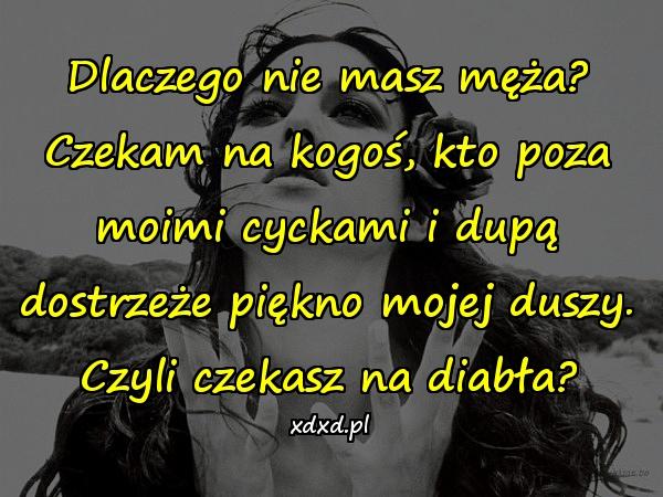 Dlaczego nie masz męża? Czekam na kogoś, kto poza moimi cyckami i dupą dostrzeże piękno mojej duszy. Czyli czekasz na diabła?