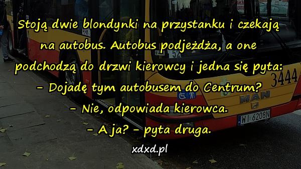 Stoją dwie blondynki na przystanku i czekają na autobus. Autobus podjeżdża, a one podchodzą do drzwi kierowcy i jedna się pyta: – Dojadę tym autobusem do Centrum? – Nie, odpowiada kierowca. – A ja? – pyta druga.