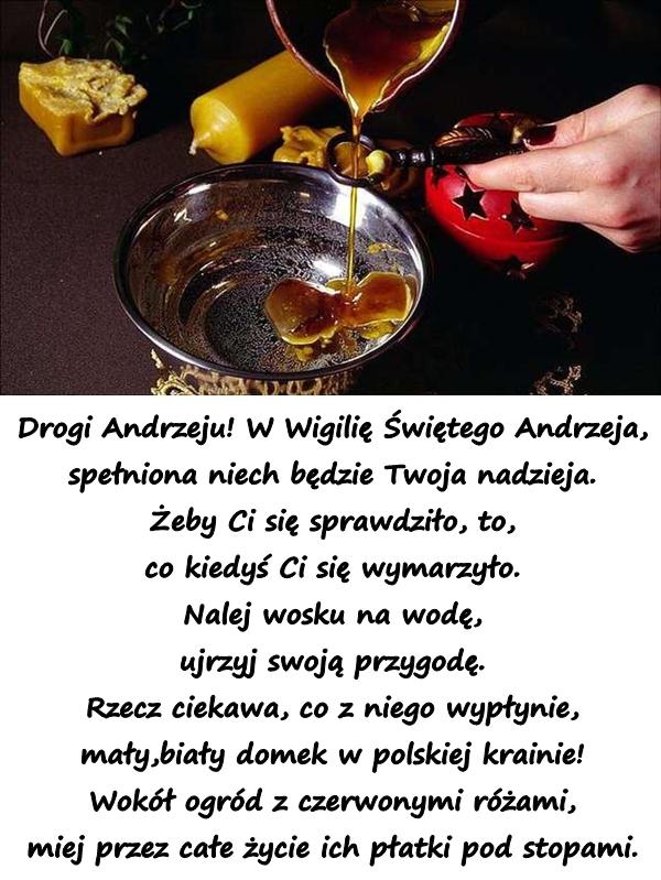 Drogi Andrzeju! W Wigilię Świętego Andrzeja, spełniona niech będzie Twoja nadzieja. Żeby Ci się sprawdziło, to, co kiedyś Ci się wymarzyło. Nalej wosku na wodę, ujrzyj swoją przygodę. Rzecz ciekawa, co z niego wypłynie, mały,biały domek w polskiej krainie! Wokół ogród z czerwonymi różami, miej przez całe życie ich płatki pod stopami.