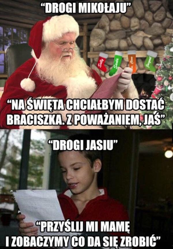 Drogi Mikołaju, na święta chciałbym dostać braciszka. Z poważaniem Jaś. Drogi Jasiu, przyślij mi mamę i z obaczymy co da się zrobić.