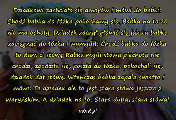 Dziadkowi zachciało się amorów i mówi do babki: Chodź babka do łóżka pokochamy się. Babka na to że nie ma ochoty. Dziadek zaczął głowić się jak tu babkę zaciągnąć do łóżka i wymyślił: Chodź babka do łóżka to dam ci stówę Babka myśli stówa piechotą nie chodzi, zgodziła się, poszła do łóżka, pokochali się, dziadek dał stówę. Wtenczas babka zapala światło i mówi: Te dziadek ale to jest stara stówa jeszcze z Waryńskim. A dziadek na to: Stara dupa, stara stówa!