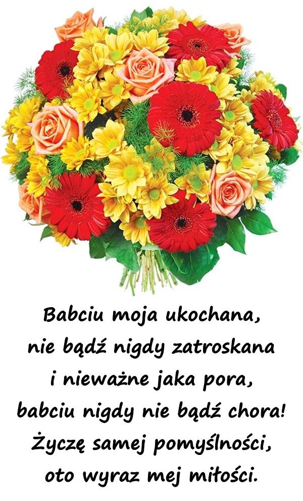 Babciu moja ukochana, nie bądź nigdy zatroskana i nieważne jaka pora, babciu nigdy nie bądź chora! Życzę samej pomyślności, oto wyraz mej miłości.