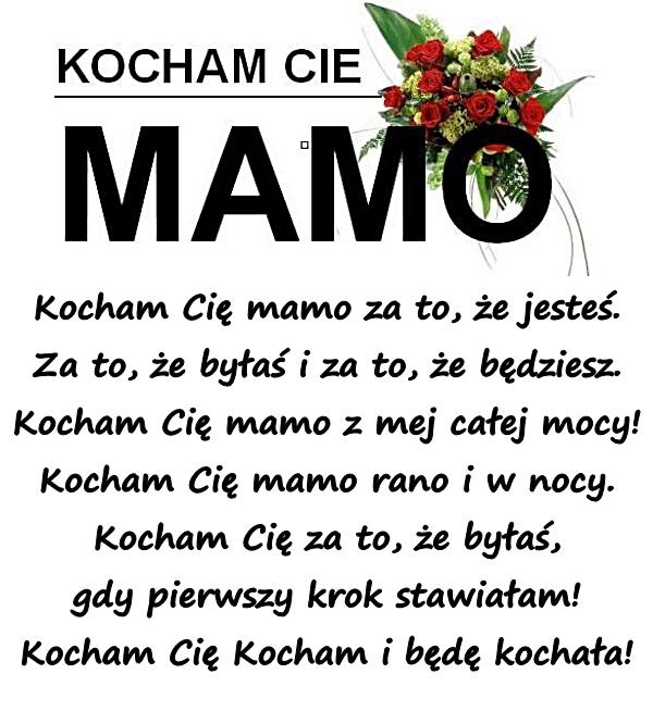 Kocham Cię mamo za to, że jesteś. Za to, że byłaś i za to, że będziesz. Kocham Cię mamo z mej całej mocy! Kocham Cię mamo rano i w nocy. Kocham Cię za to, że byłaś, gdy pierwszy krok stawiałam! Kocham Cię Kocham i będę kochała!