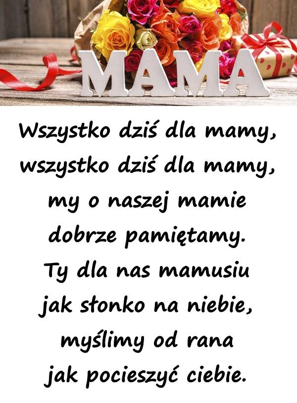 Wszystko dziś dla mamy, wszystko dziś dla mamy, my o naszej mamie dobrze pamiętamy. Ty dla nas mamusiu jak słonko na niebie, myślimy od rana jak pocieszyć ciebie.