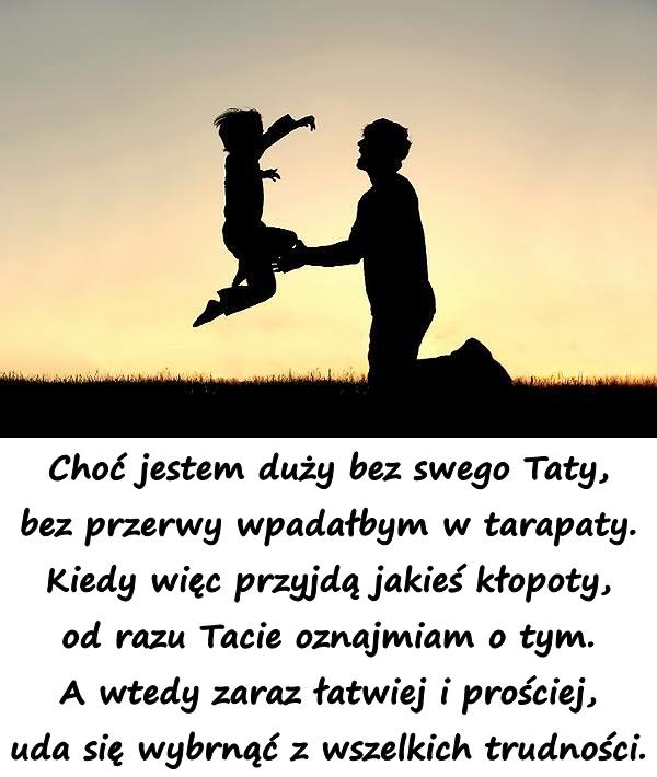 Choć jestem duży bez swego Taty, bez przerwy wpadałbym w tarapaty. Kiedy więc przyjdą jakieś kłopoty, od razu Tacie oznajmiam o tym. A wtedy zaraz łatwiej i prościej, uda się wybrnąć z wszelkich trudności.