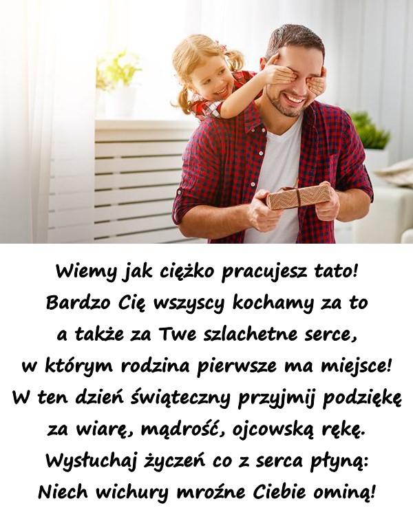 Wiemy jak ciężko pracujesz tato! Bardzo Cię wszyscy kochamy za to a także za Twe szlachetne serce, w którym rodzina pierwsze ma miejsce! W ten dzień świąteczny przyjmij podziękę za wiarę, mądrość, ojcowską rękę. Wysłuchaj życzeń co z serca płyną: Niech wichury mroźne Ciebie ominą!