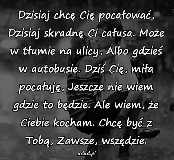 Dzisiaj chcę Cię pocałować, Dzisiaj skradnę Ci całusa. Może w tłumie na ulicy, Albo gdzieś w autobusie. Dziś Cię, miła pocałuję, Jeszcze nie wiem gdzie to będzie. Ale wiem, że Ciebie kocham. Chcę być z Tobą, Zawsze, wszędzie.