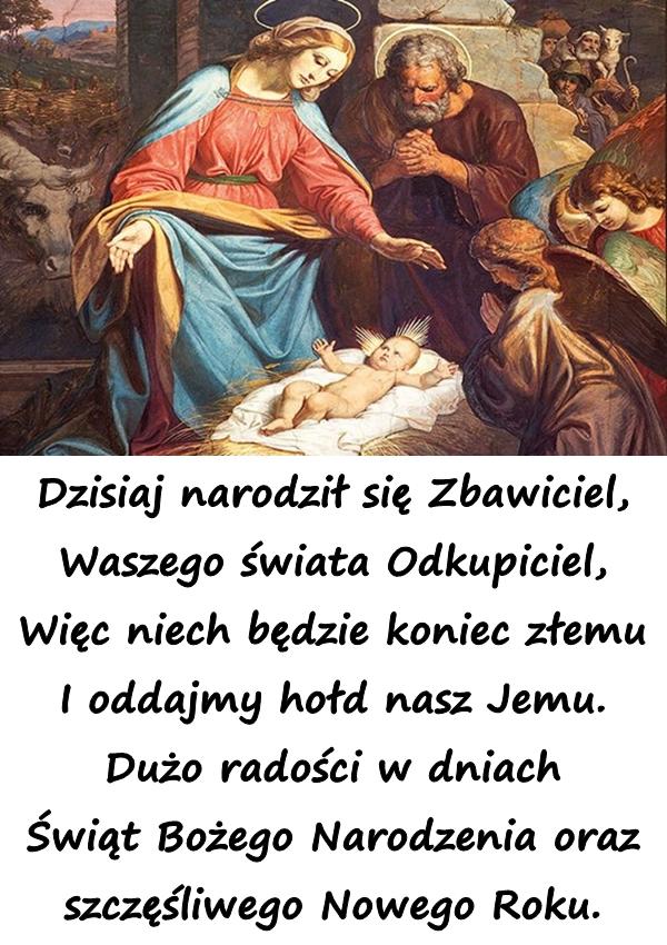 Dzisiaj narodził się Zbawiciel, Waszego świata Odkupiciel, Więc niech będzie koniec złemu I oddajmy hołd nasz Jemu. Dużo radości w dniach Świąt Bożego Narodzenia oraz szczęśliwego Nowego Roku.