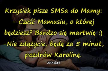Krzysiek pisze SMSa do Mamy: – Cześć Mamusiu, o której będziesz? Bardzo się martwię 🙂 -Nie zdążycie, będę za 5 minut, pozdrów Karolinę.