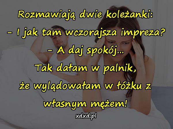 Rozmawiają dwie koleżanki: – I jak tam wczorajsza impreza? – A daj spokój… Tak dałam w palnik, że wylądowałam w łóżku z własnym mężem!