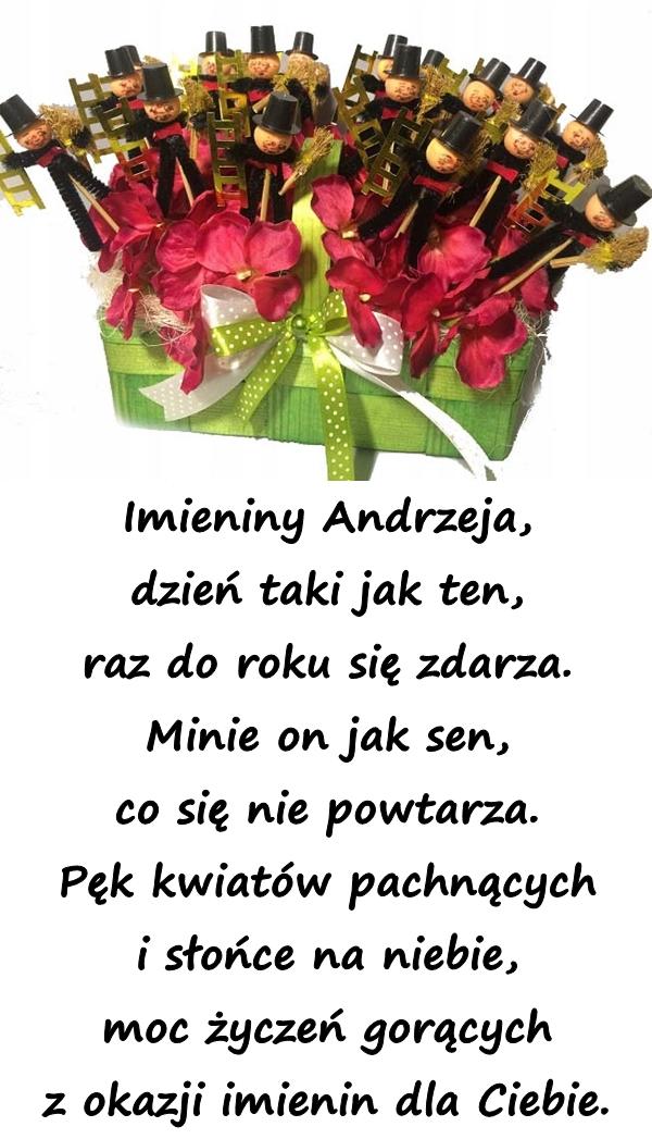 Imieniny Andrzeja, dzień taki jak ten, raz do roku się zdarza. Minie on jak sen, co się nie powtarza. Pęk kwiatów pachnących i słońce na niebie, moc życzeń gorących z okazji imienin dla Ciebie.