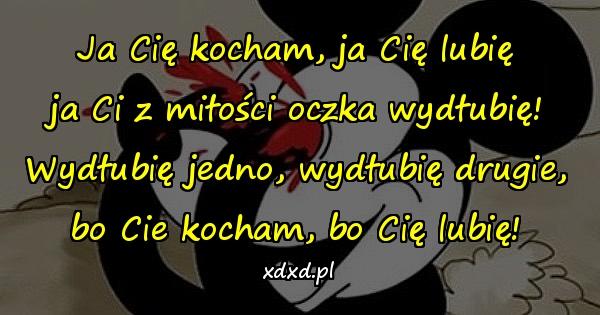 Ja Cię kocham, ja Cię lubię ja Ci z miłości oczka wydłubię! Wydłubię jedno, wydłubię drugie, bo Cie kocham, bo Cię lubię!