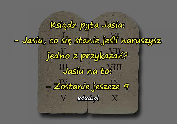 Ksiądz pyta Jasia: – Jasiu, co się stanie jeśli naruszysz jedno z przykazań? Jasiu na to: – Zostanie jeszcze 9