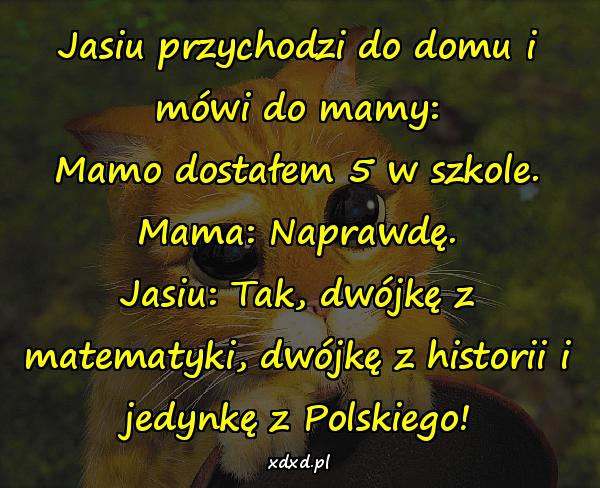 Jasiu przychodzi do domu i mówi do mamy: Mamo dostałem 5 w szkole. Mama: Naprawdę. Jasiu: Tak, dwójkę z matematyki, dwójkę z historii i jedynkę z Polskiego!