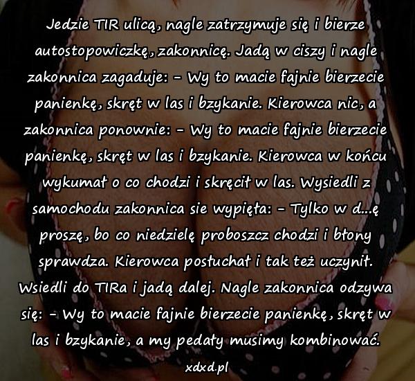 Jedzie TIR ulicą, nagle zatrzymuje się i bierze autostopowiczkę, zakonnicę. Jadą w ciszy i nagle zakonnica zagaduje: – Wy to macie fajnie bierzecie panienkę, skręt w las i bzykanie. Kierowca nic, a zakonnica ponownie: – Wy to macie fajnie bierzecie panienkę, skręt w las i bzykanie. Kierowca w końcu wykumał o co chodzi i skręcił w las. Wysiedli z samochodu zakonnica sie wypięła: – Tylko w d…ę proszę, bo co niedzielę proboszcz chodzi i błony sprawdza. Kierowca posłuchał i tak też uczynił. Wsiedli do TIRa i jadą dalej. Nagle zakonnica odzywa się: – Wy to macie fajnie bierzecie panienkę, skręt w las i bzykanie, a my pedały musimy kombinować.