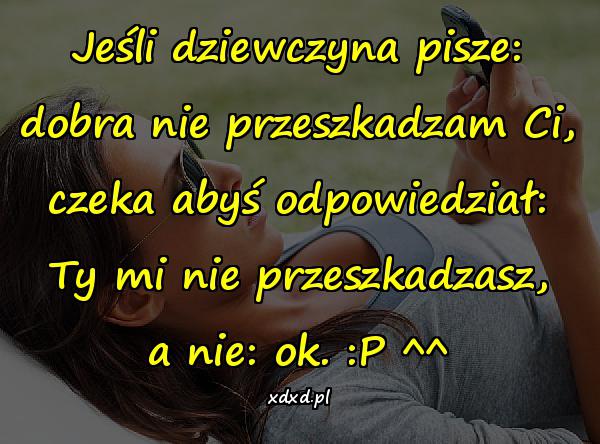 Jeśli dziewczyna pisze: dobra nie przeszkadzam Ci, czeka abyś odpowiedział: Ty mi nie przeszkadzasz, a nie: ok. 😛 ^^