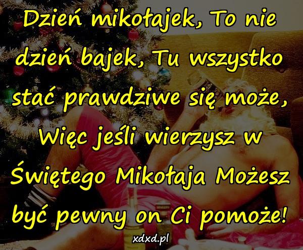 Dzień mikołajek, To nie dzień bajek, Tu wszystko stać prawdziwe się może, Więc jeśli wierzysz w Świętego Mikołaja Możesz być pewny on Ci pomoże!