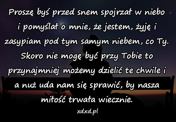 Proszę byś przed snem spojrzał w niebo i pomyślał o mnie, że jestem, żyję i zasypiam pod tym samym niebem, co Ty. Skoro nie mogę być przy Tobie to przynajmniej możemy dzielić te chwile i a nuż uda nam się sprawić, by nasza miłość trwała wiecznie.