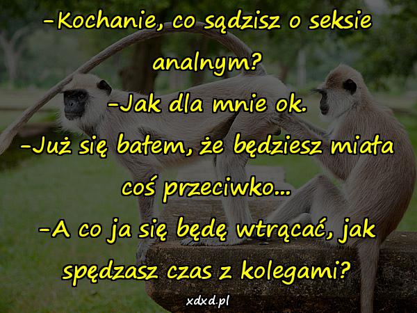 -Kochanie, co sądzisz o seksie analnym? -Jak dla mnie ok. -Już się bałem, że będziesz miała coś przeciwko… -A co ja się będę wtrącać, jak spędzasz czas z kolegami?