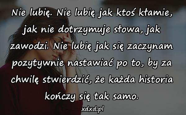 Nie lubię. Nie lubię jak ktoś kłamie, jak nie dotrzymuje słowa, jak zawodzi. Nie lubię jak się zaczynam pozytywnie nastawiać po to, by za chwilę stwierdzić, że każda historia kończy się tak samo.