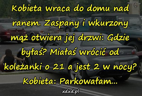 Kobieta wraca do domu nad ranem. Zaspany i wkurzony mąż otwiera jej drzwi: Gdzie byłaś? Miałaś wrócić od koleżanki o 21 a jest 2 w nocy? Kobieta: Parkowałam…