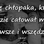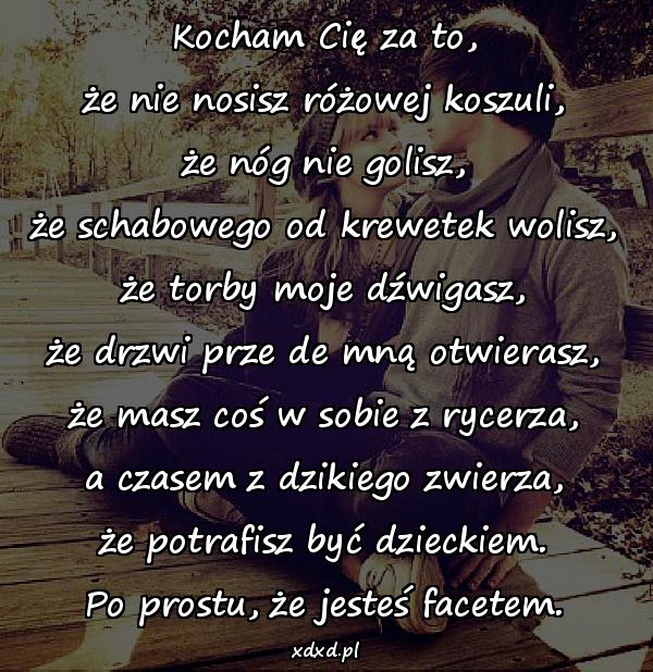 Kocham Cię za to, że nie nosisz różowej koszuli, że nóg nie golisz, że schabowego od krewetek wolisz, że torby moje dźwigasz, że drzwi prze de mną otwierasz, że masz coś w sobie z rycerza, a czasem z dzikiego zwierza, że potrafisz być dzieckiem. Po prostu, że jesteś facetem.